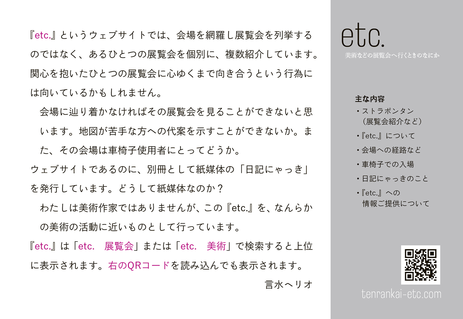 『etc.』を発行するという行いあるいは試みが今後どのように運んでいくかは予測がつきません。ご活用いただけたらありがたく思います。