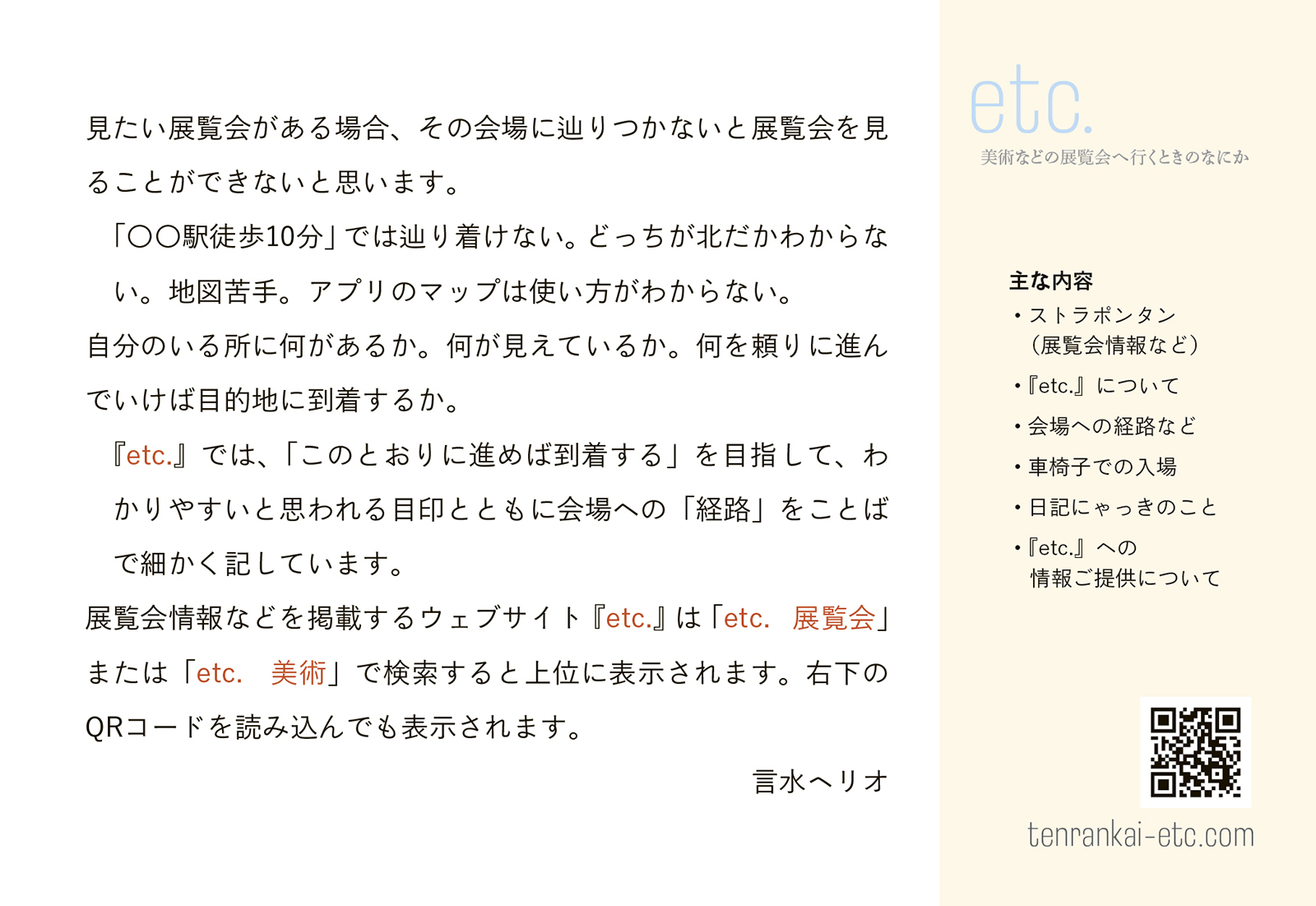 『etc.』の名を引継ぎはしましたが、このウェブサイトは紙媒体の頃とは内容が違います。当初から誌面の大半をしめていた展覧会のスケジュール一覧を、ウェブサイトとしてつくることは断念しました。ウェブの知識のない者にもできる範囲のことからすこしずつ始めることにしました。作成途中の段階から公開してしまいましたし、いつまでも整わないかもしれません。それから、ご覧いただくと明らかなように、掲載の会場が関東、とくに東京に偏っています。東京在住の個人がやっており、各地に飛び回ることもできず、限界がありますが、さまざまな場所でさまざまな活動が行われていると思います。各地の展覧会、会場など、お知らせいただけたら幸いです。