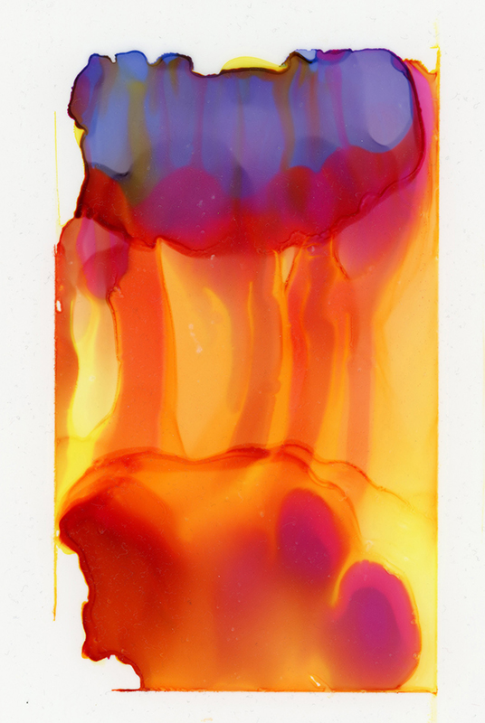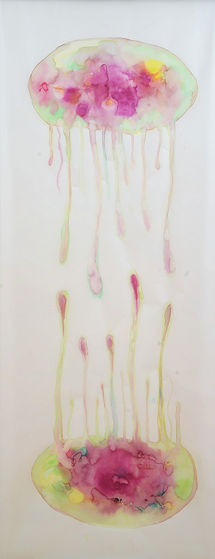 半透明の支持体であるユポ紙にインクを流し、彩度の高い色彩を重ねていくことで、イメージを生成、流動させるのが、早川有紀の絵画の特徴です。それらは細胞レベルでの生命の働きを彷彿とさせ、またあるときは内臓レベルに蓄積された感覚、あるいは意識に湧き出した感情そのもののようにも見えます。