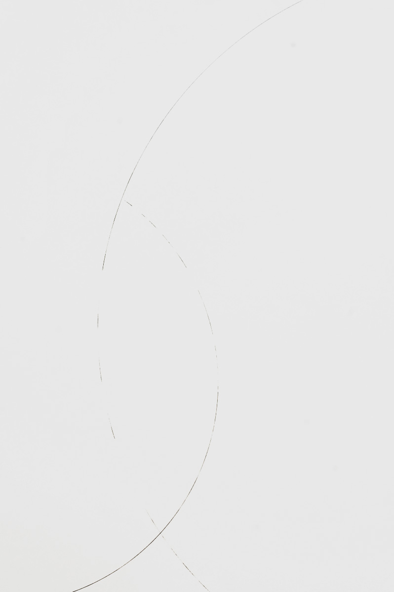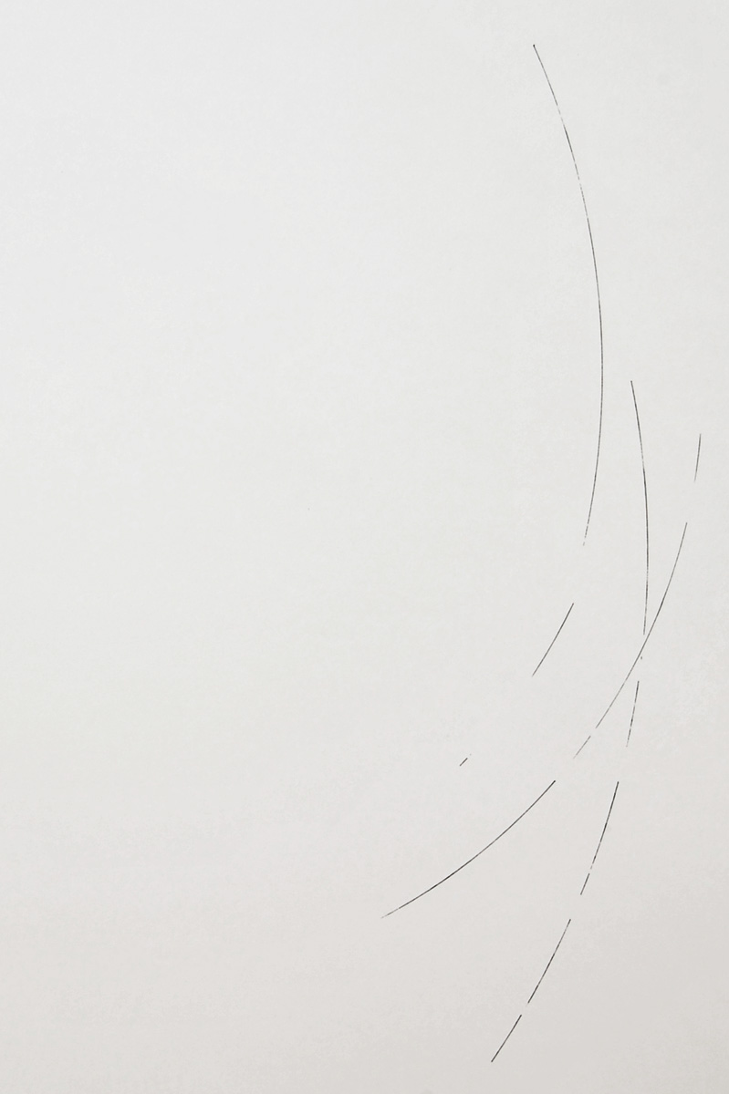 真っ白な平面に現れるや否や瞬時に消えてしまいそうな、限界まで研ぎ澄まされた直線、曲線、点。細谷俊一郎(Hosoya Shunichiro)のドローイングは、私たちの生きる現実世界に存在する何らかの対象を描くのではなく、また、何らかの抽象的な造形原理を目指すのでもありません。それは絶対的な「真理」に迫ろうとする彼の形而上学的な思考が、現実の二次元空間上に軌跡として刻みつけられたものなのです。その軌跡は語り得ないものを語るために究極の自由へと向かいます。
