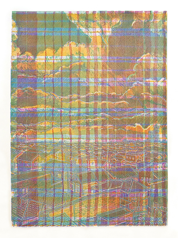 遮るはずの布にすごく遠くのいつかいた光景が浮かび上がったら…それをぺらっとめくることのできる紙を媒介して遠くの世界とつながることができたなら、と考えました。展示ではぺらっとはできませんが、すぐに形の変化するような素材、可変的なことは、私にとって自然なことだと思えます。それは、木版という技法、水性の絵具にもいえることで、季節、場所、天候すべての要素に振り回され、同時にその時々を摺り取ることができます。