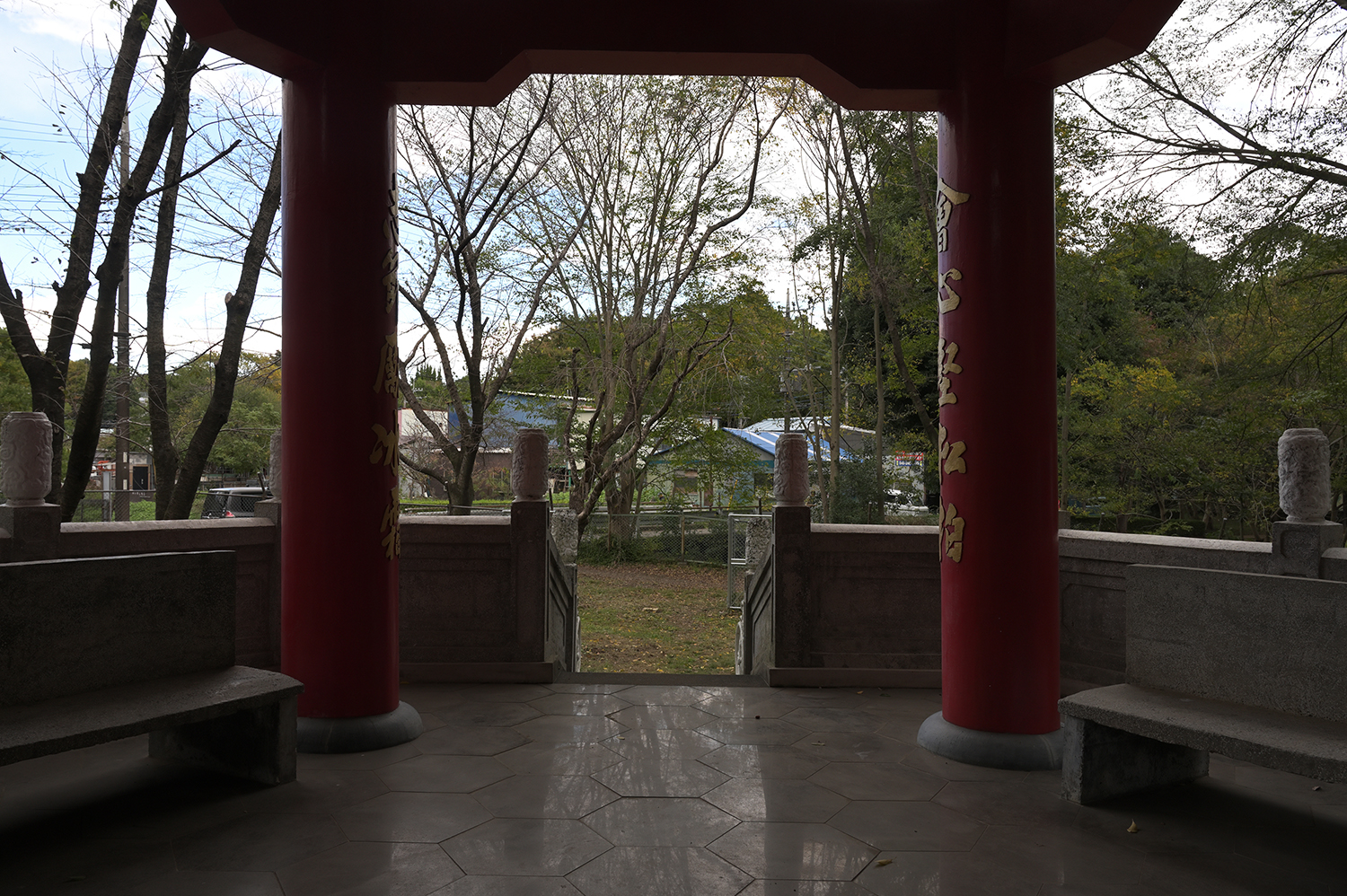 小田急江ノ島線大和駅から徒歩20分のところに「ふれあいの森」と名付けられた公園がある。引地川が流れる公園の中を歩いていると緑豊かな公園の一角に「台湾亭」と名付けられた建物があった。高さ約10m、朱色に塗られた6本の柱が屋根を支えている。建物を囲むフェンスに設置された説明を読むと、現在の座間市に戦闘機を生産する「高座海軍工廠」があり、台湾から選抜された8,000人以上の少年工が日本に渡り生産に従事したとある。現在の公園がある大和市上草柳に少年工が暮らした寄宿舎があったらしい。日本の敗戦後少年工たちは台湾に帰国したが1992年に大和市を再訪、以来交流を経て「台湾亭」はかつての少年工の同窓組織「台湾高座会」から大和市に寄贈されたと記されていた。