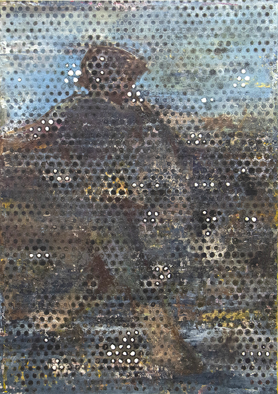 最近ではミレーの「種をまく人」を油彩で模写してはその表面を「germination on the table」同様に穴の開いた鉄板にバーナーの炎を入れて焼き、焼けた穴から石膏の発芽した状態の平面表現に取り組んでいる。種まきしている農夫を種に見立てた絵の具の炭化跡と石膏の盛り上がりによって、油画としての具象性の意味を消滅させたいと思い、行為を繰り返すのだ。