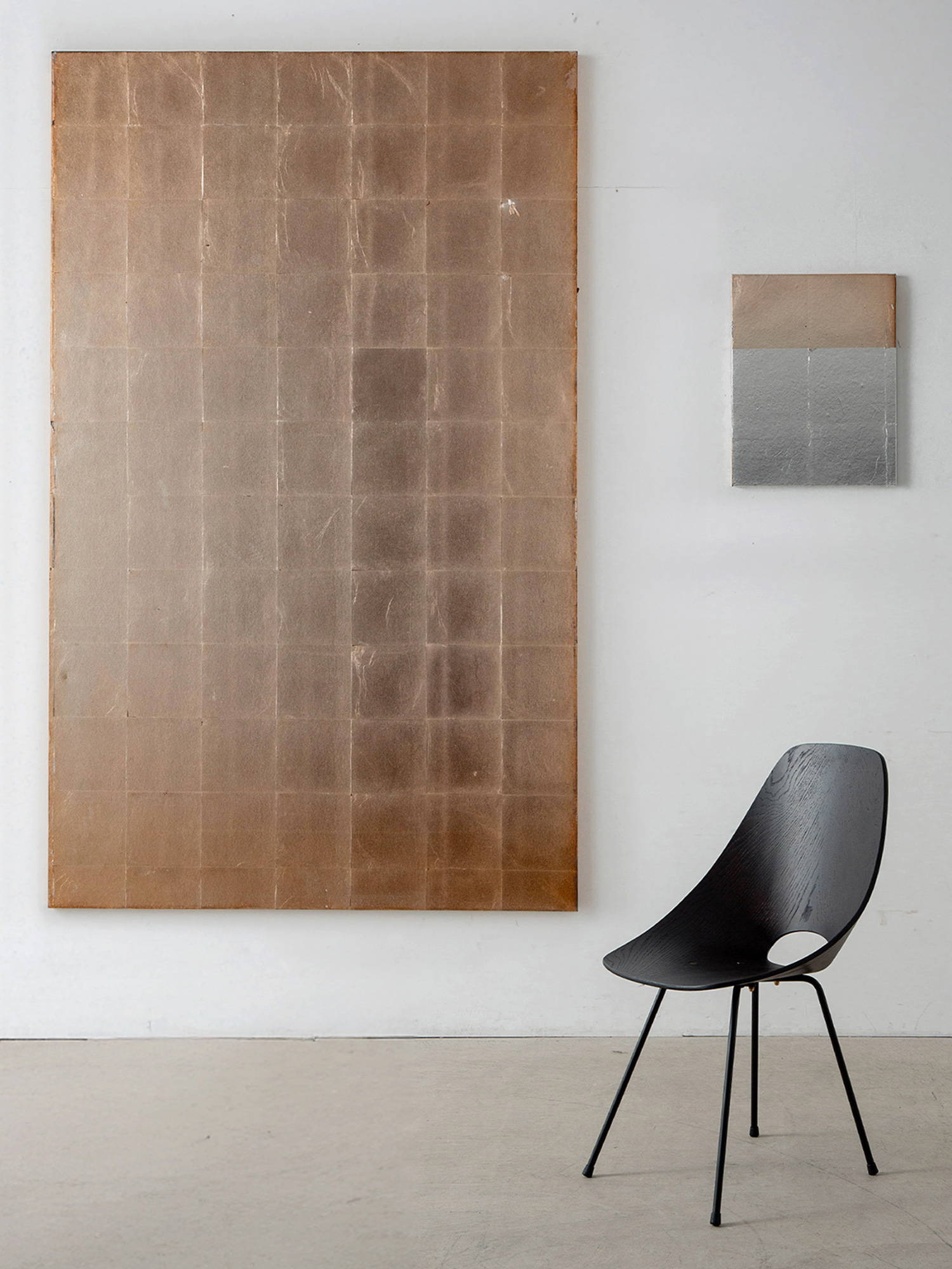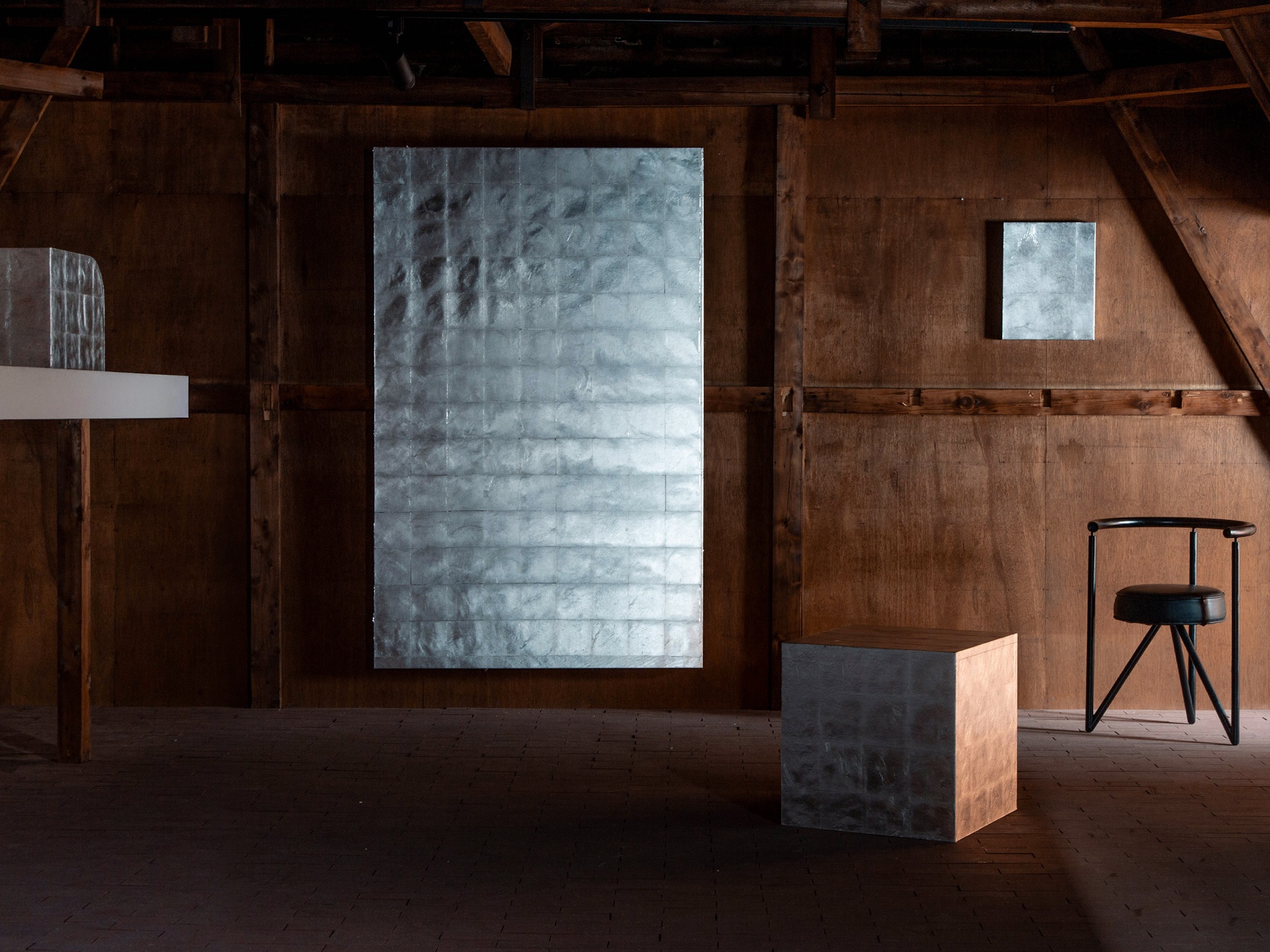 本展「Presence(佇まい)」は、こうした福田周平の実践を、特定の場所と空間条件のもとで立ち上げる試みです。会場となる stoop は、ヴィンテージの家具や生活の痕跡を内包した空間であり、展示空間そのものが固有の時間性と物質的な密度を備えています。ここで作品は、空間から切り離された展示物としてではなく、光や空気、周囲の物質、人の気配と関係を結びながら存在します。銀箔は空間の一部として環境に応答し、作品は場所の記憶と現在進行する時間が交差する場として経験されます。