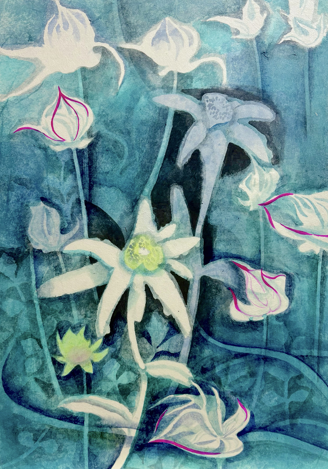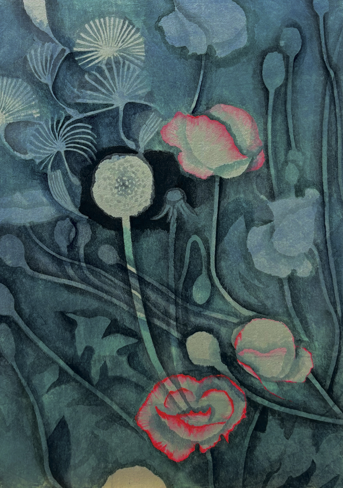 手嶋遥は、実際に自然の中を歩きながらスケッチを重ね、そこから日本画の制作へと展開していきます。今回の制作では、これまで以上にドローイングにも力を注いでおります。