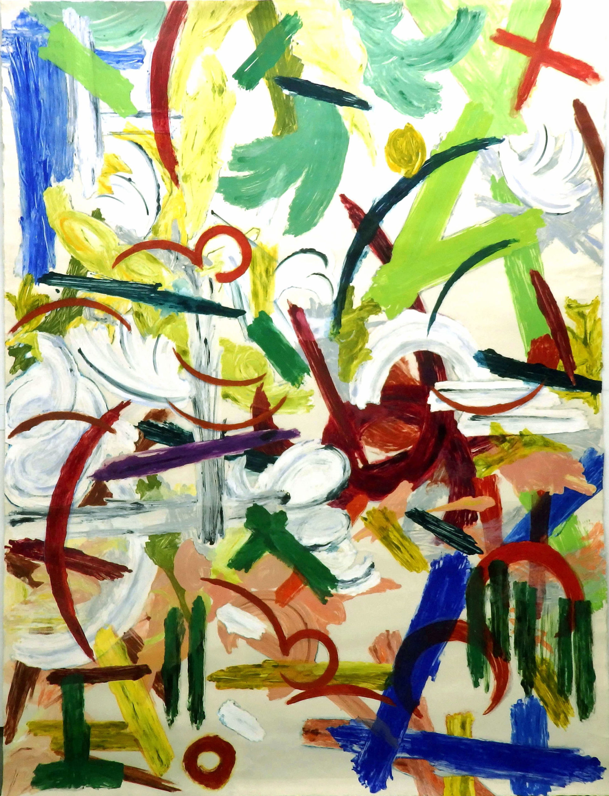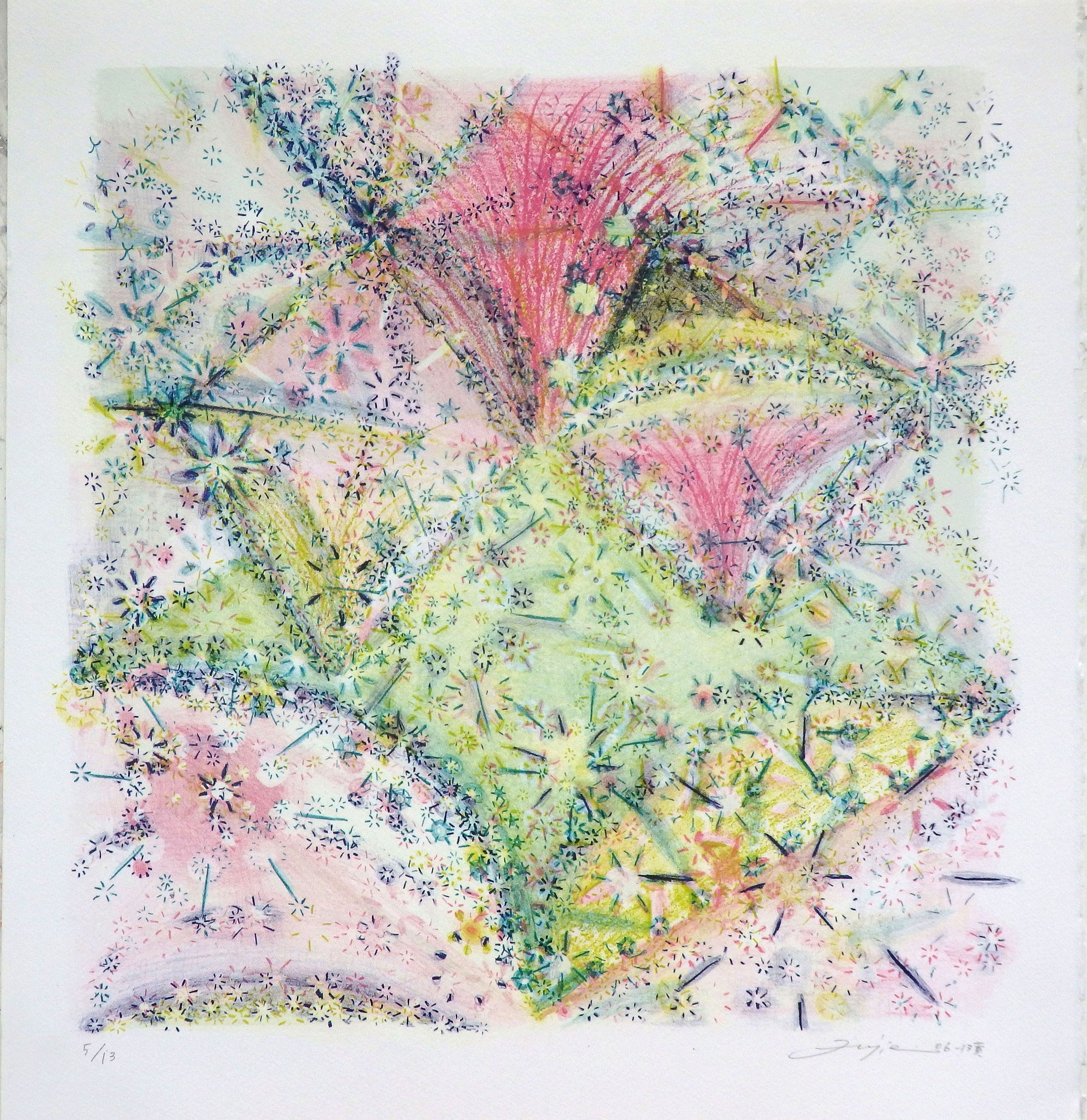70年代後半にリトグラフの画面作りを大きく変え、意味を持たない筆跡だけで多色刷り版画を制作しはじめた。筆跡は、なぜその形なのかの過程を示すためなので、はっきり出したかった。リトグラフの版へタッチを直書きすると、版は油性を感じやすく筆跡としては残りにくいので、一旦フィルム上に揮発性油で溶いた油性インクで筆跡を作ってから版上に転写。主版というものはなく色数分の版を並べ、同時に複数の版を描きすすめる。下絵というものがないので、刷ってみないと版と版がどんな出会い方をするのか、完成したときの画面は明確にはつかめていない。80年代制作のそれらの作品から後のリトグラフに至るまで、最初の描画段階から色数の版を並べて同時進行する版の作り方は変わらない。