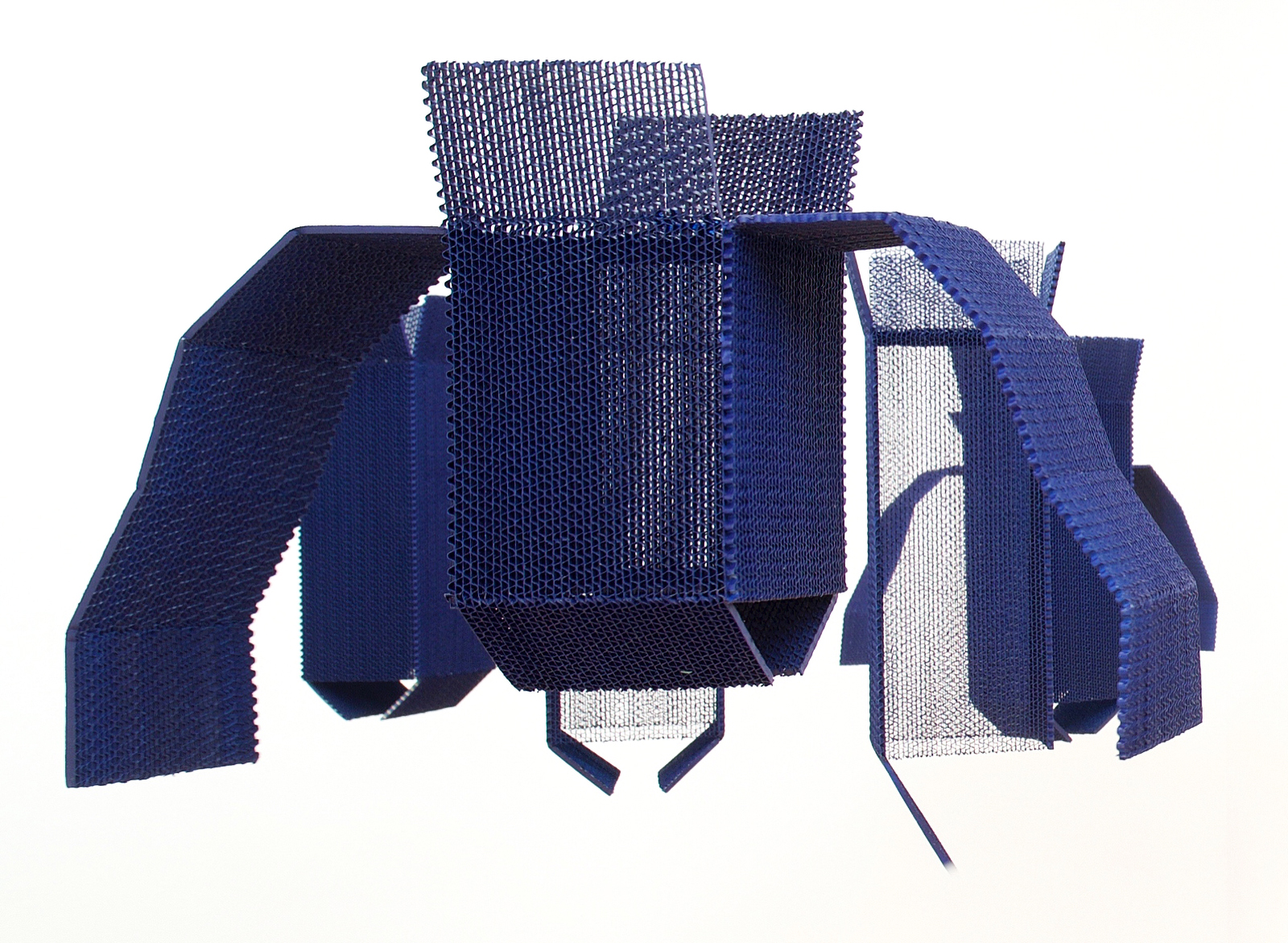 段ボールを細い帯状に裁断、内部の波型が外面へと変換されるように接合し直して新たな面を作り、それらを組み合わせてできる立体が林立すると、それぞれが互いに干渉しあいながら生み出す陰影は、私たちを瞑想の時間へと誘います。